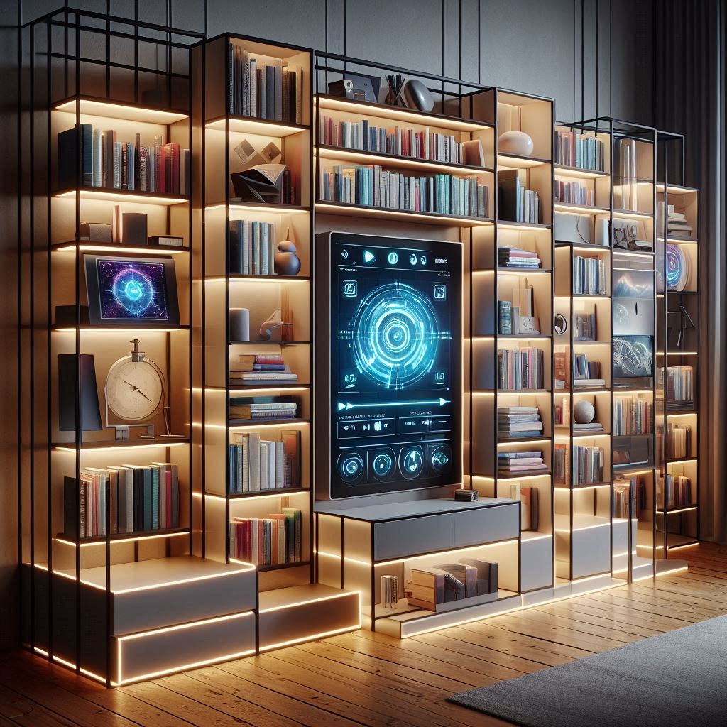 Estanterías modulares digitales con iluminación LED automática, integración con asistentes de voz y estantes móviles controlados por app.